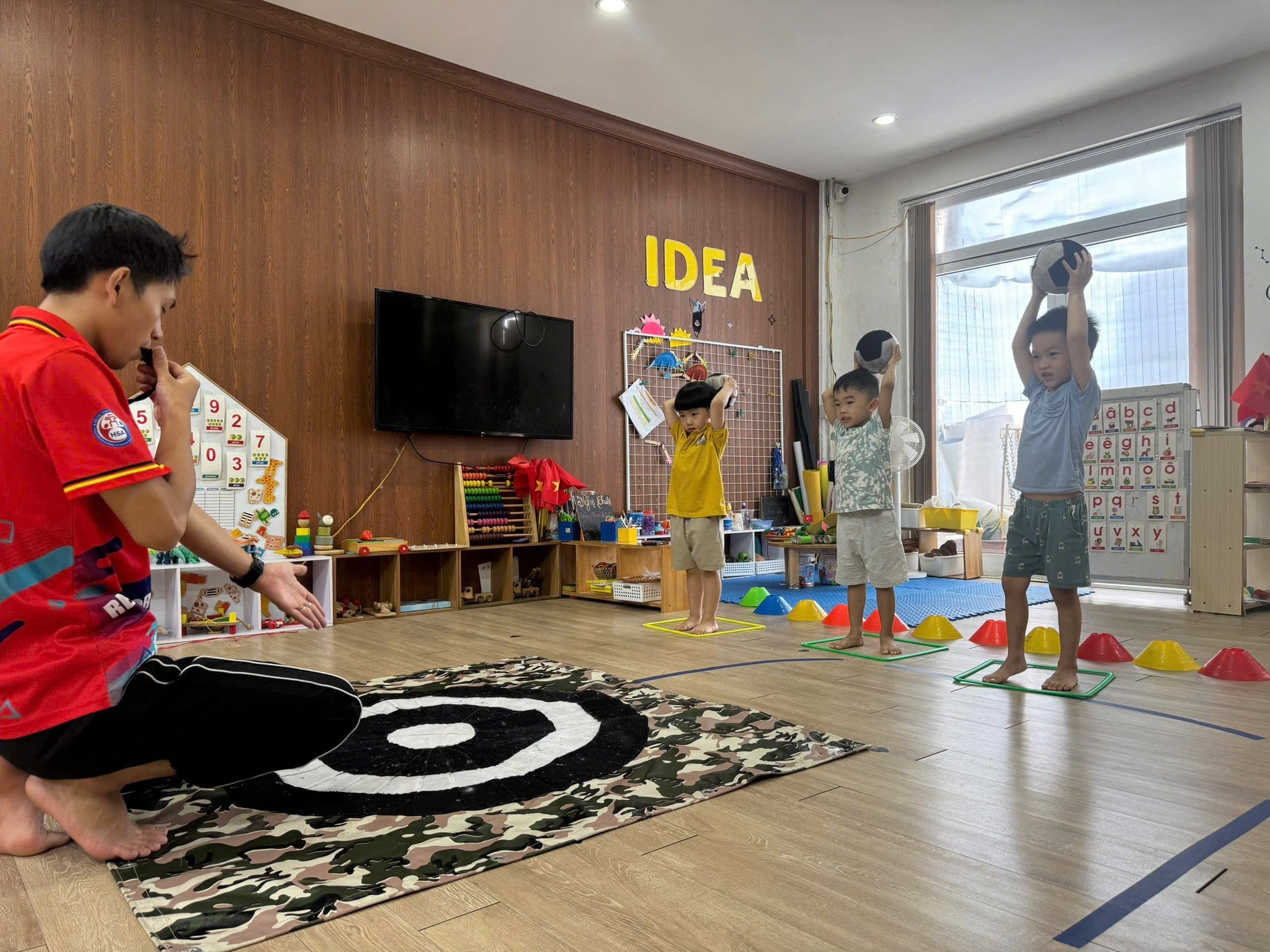 Khu vực vận động trong nhà với thảm êm và dụng cụ thể dục.